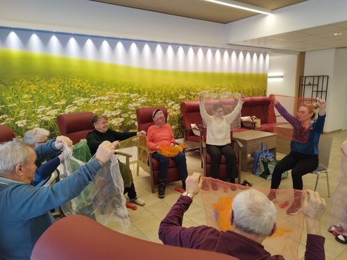 Mit Musik, verschiedenen Bällen, bunten Tüchern, Gymnastikbändern und vielen weiteren kreativen Hilfsmitteln wird auf spielerische und motivierende Weise die Beweglichkeit, Koordination und Kraft gefördert. Dabei steht stets die Freude an der Bewegung im Vordergrund. Die Übungen werden individuell angepasst, sodass alle Gäste – unabhängig von ihren körperlichen Voraussetzungen – aktiv teilnehmen können.
